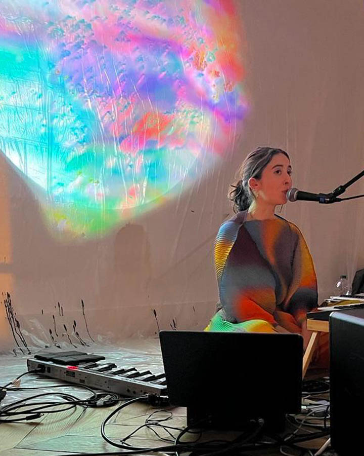 Inspired by sound therapy practices, this intimate participatory performance approaches music as a sensory experience rather than a frontal or demonstrative act. It begins with a collective breathing phase, followed by guided intuitive vocalizations, inviting participants to explore their body and voices as instruments of vibration and resonance, both individual and collective. The drone emerging from the collective singing becomes the foundation of a live ambient improvisation, blending vocal, synth, electroacoustic textures and field recordings, in dialogue with an evolving organic visual projection. This performance alters the quality of musical listening, conceiving immersion not as a technological or artificial exploration, but through the body and the inner and outer vibrations of each participant as a way of "making" music.